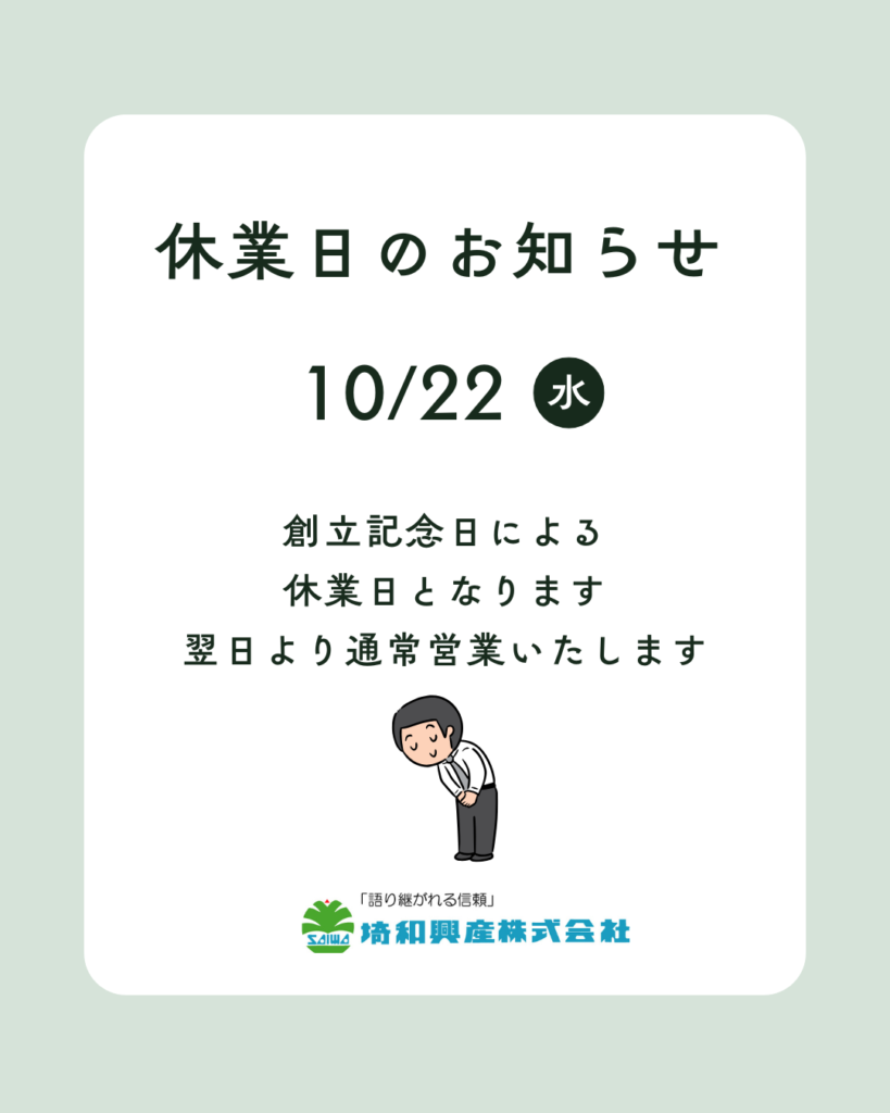 誠に勝手ながら、弊社創立記念日により下記日時を休業日とさせていただきます。