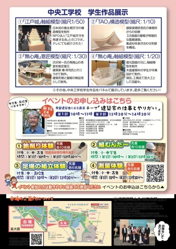 中学生・高校生におすすめの建築士・並木栄浩氏による「建築家の仕事とやりがい」をテーマにした講演会をはじめ、鉋(かんな)削り体験や足場組立体験、測量体験など、将来の仕事を考えるきっかけになる多彩なワークショップが盛りだくさん!