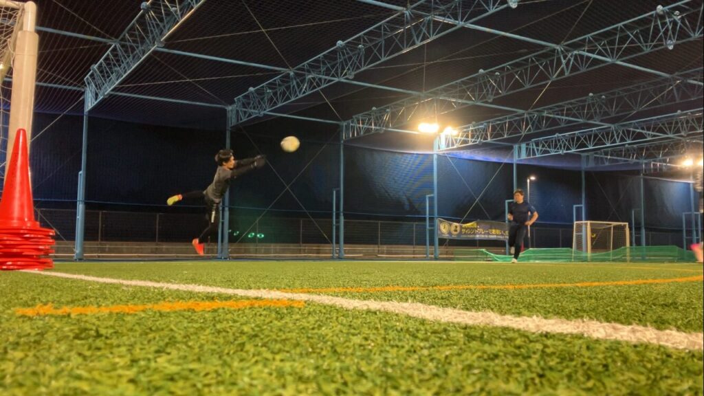 この練習ではフットサルゴールを2個並べているため、飛んでいますが、