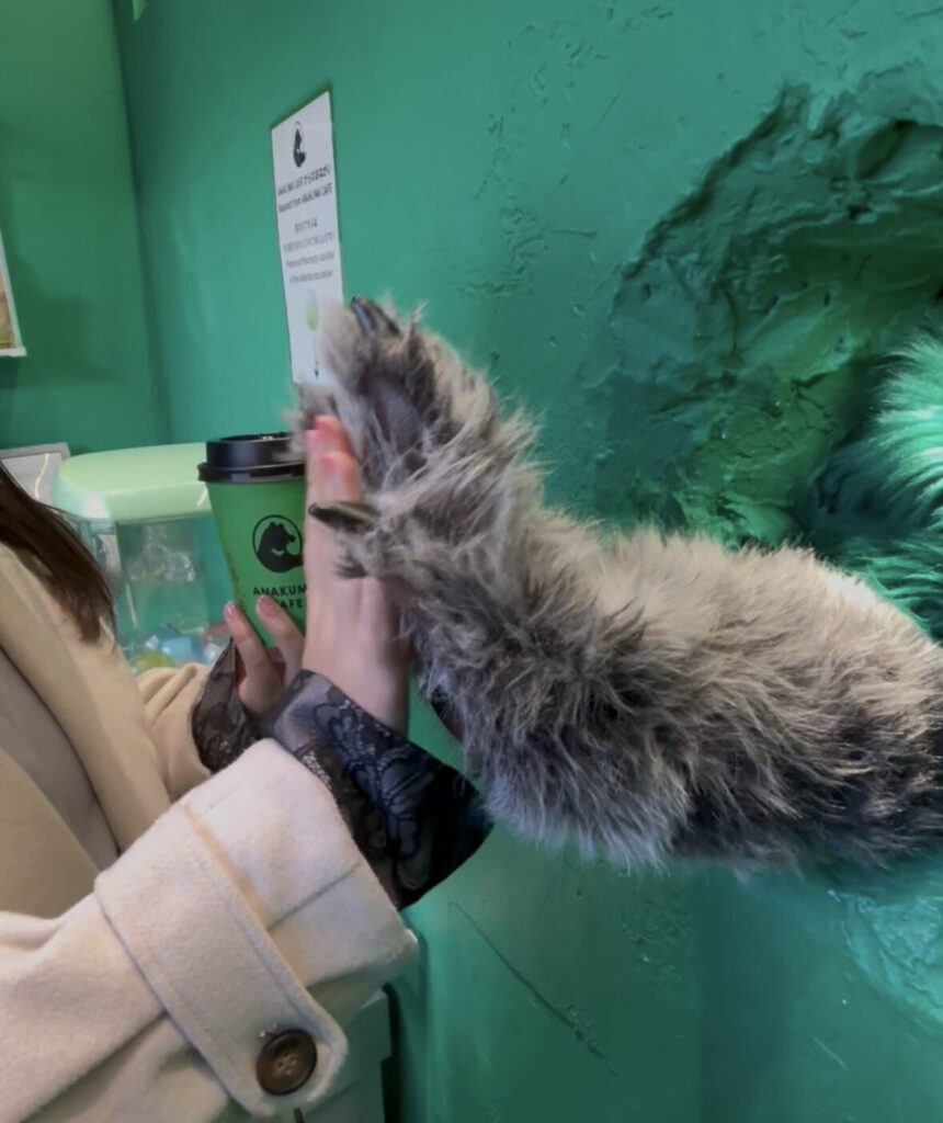 壁掛けパネルで注文と支払いを済ますと、壁の穴からクマさんが手を出してきます。